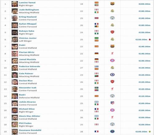 全球19位亿元先生:亚马尔2亿欧领衔,登贝莱1亿欧登榜,德英未更新