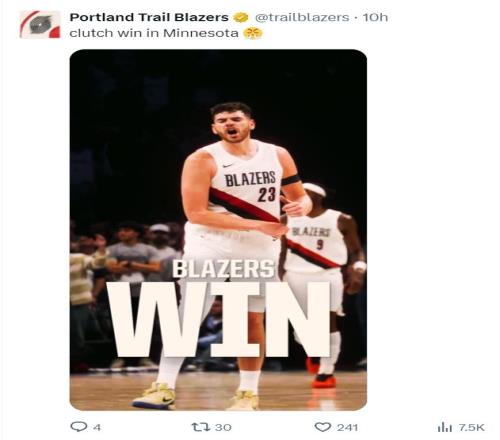 开拓者拿到三连胜,而快船吞下4连败,勇士队最近的21场比赛输掉了16场,开拓者已经反超快船升至西部第八,开拓者已经领先勇士1.5个胜场,开拓者近来状态真的不错。